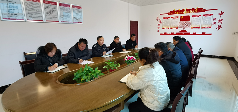 王珑(左三)与村支两委成员研究部署春节前夕的重点工作(胡卫红 摄)