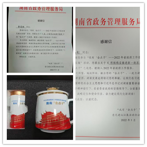 连日来,共青团桃江县委书记鲁定红、桃江县沾溪镇卫生院院长夏永利等先后收到了湖南省政务管理服务局寄送的感谢信和礼物,他们的“金点子”被纳入了2022年省政府工作报告。