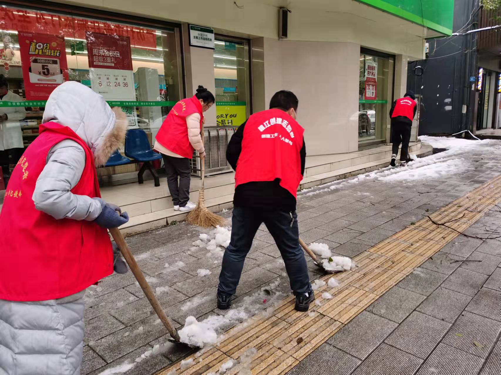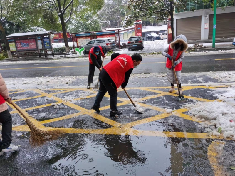 志愿者们不畏严寒,挥动着铁锹、雪铲、扫帚等工具,齐心协力铲雪除冰、清理积雪压断树枝。在大家的辛勤努力下,责任路段上的冰雪被清除干净,有效保障了居民出行顺畅。