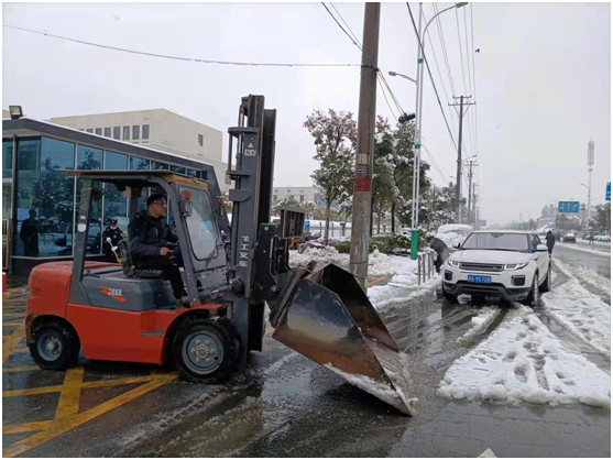 20余名干部职工和志愿者有的铲雪、有的撒盐,装载机在一派热火朝天的景象中来回开动,协助大家加速完成清理工作,在大家挥动的铁锹和机械的轰鸣声中积雪很快被清理干净,确保了园区企业的安全生产。