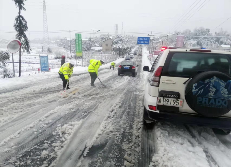 为确保安全,民警对该路段实行一次放行一辆车的方式通行,同时还调集警力配合桃花江镇镇村干部对路面进行铲雪除冰作业,护航车辆安全通过结冰路段。经过2个半小时的除雪作业,道路恢复正常通行。“我们镇村干部大概来了30多个,除了这个风口,前面不远处的下坡还有党员志愿者在除雪。”桃花江镇党委副书记汤森林告诉记者。