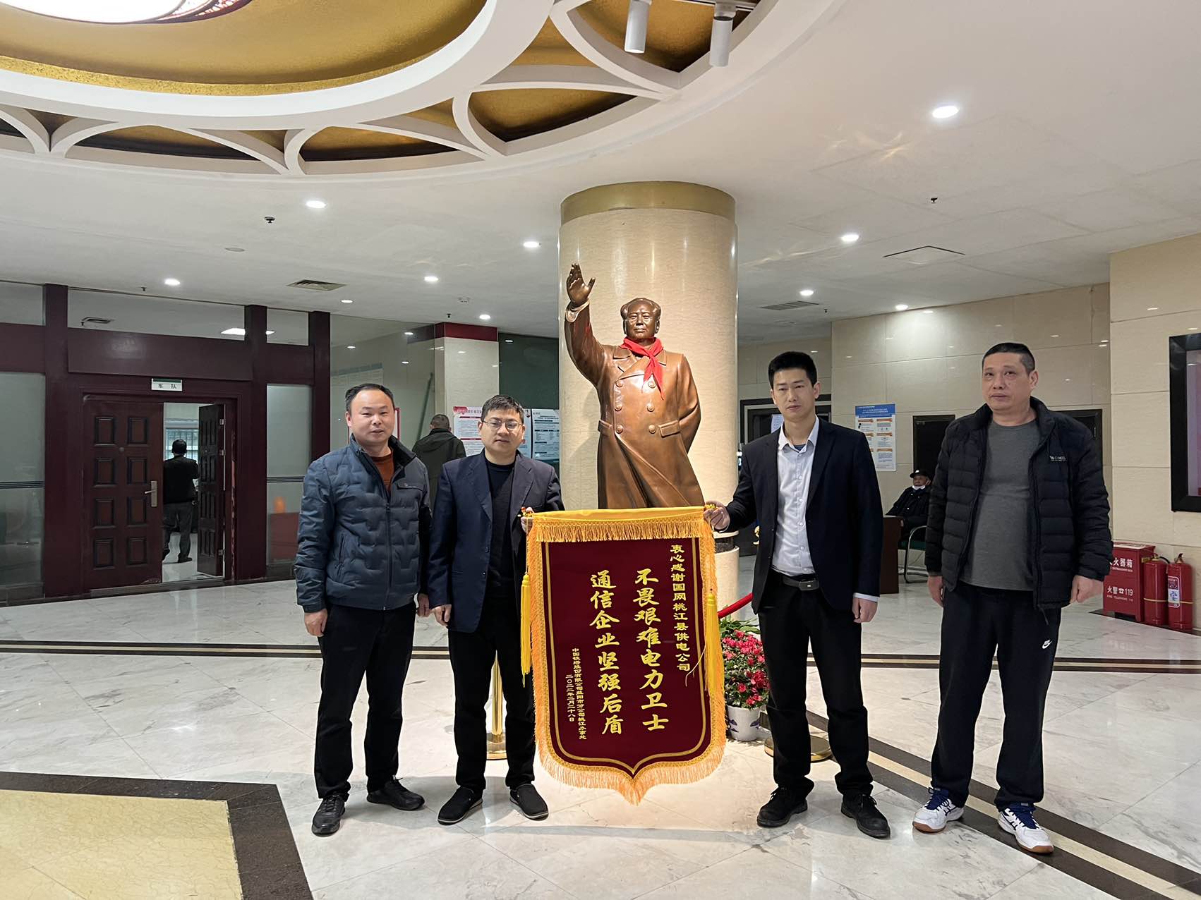 3月1日上午,中国铁塔股份有限公司益阳市分公司桃江办事处负责人来到国网桃江县供电公司,将一面印有“不畏艰难电力卫士,通信企业坚强后盾”的锦旗送到了该公司负责人手中,感谢国网桃江县供电公司冰冻灾害天气下对铁塔公司安全用电给予的大力支持。