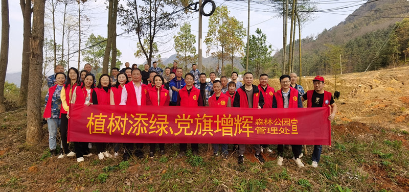 在位于桃花江国有林场龙虎山工区小阳冲地段的植树现场,党旗飘扬,人头攒动,大家齐心协力,配合默契,干劲十足。运苗、打洞、栽树、培土、浇水,大家严格按照苗木栽植技术要求,有条不紊完成每道工序,栽下一棵棵希望的树苗,确保栽一棵、活一棵,植一片、绿一方。