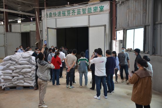 培训中,技术人员采取理论教学、经验交流和现场演示的方式,就水稻机插机抛育秧技术从播种、消毒、覆膜催芽等常规育秧技术进行现场培训。各与会人员参观育秧流水线生产车间及密室催芽齐苗设备后,对水稻机插机抛育秧的高效作业和效果称赞不已。