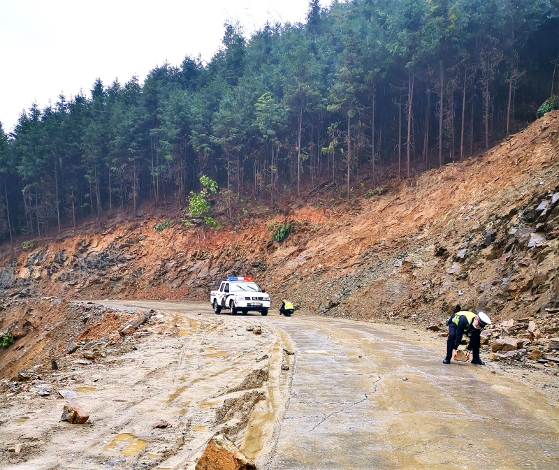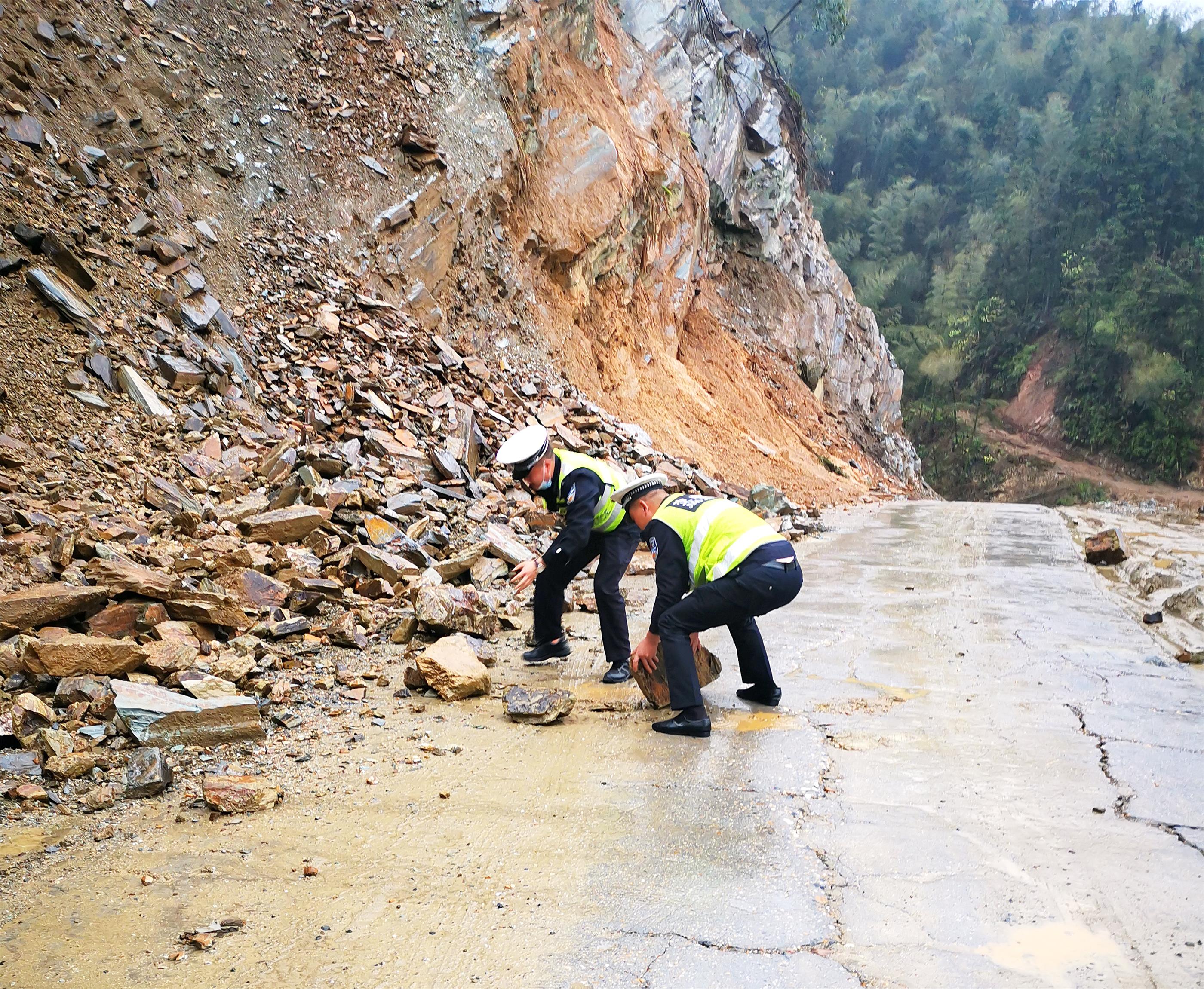 3月31日一大早,风急雨仍骤,刚在城区早高峰勤务值完班的桃花江交警中队副中队长肖建兵,就赶紧带领一组巡逻警力沿县道033线往高桥镇方向巡查而去。不多久,巡逻警力在乡道527线改扩施工路段发现一处轻微山体滑坡险情,在确保自身安全的前提下,他们第一时间清理了路面上滚落的石头泥块,并对过往车辆采取了限行管理措施,同步将现场情况向所在地乡镇政府做了报告。
