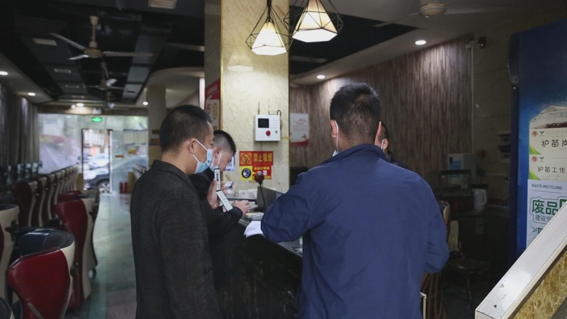 图为工作人员对灵知网吧疫情防控台账进行检查