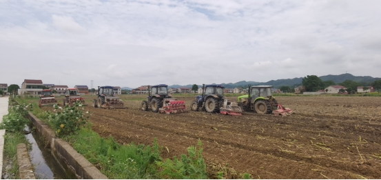 5月24日下午,位于石牛江镇小坡头村的“桃江县严管区产业结构调整核心示范片”里,7台油菜联合播种机一字排开,正在稻田里播种大豆和玉米。