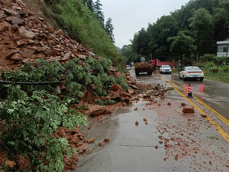 险情发生后,县公安交警部门、交通部门及公路部门迅速调派人员、大型机械设备、运输货车等赶赴现场,设置警示牌、锥形筒等安全设施后,在确保作业安全的前提下,县公路建设养护中心迅速对塌方体、泥石流等进行清理,截至6月3日下午1点,已抢通塌方路段5处,清理塌方近3000方。