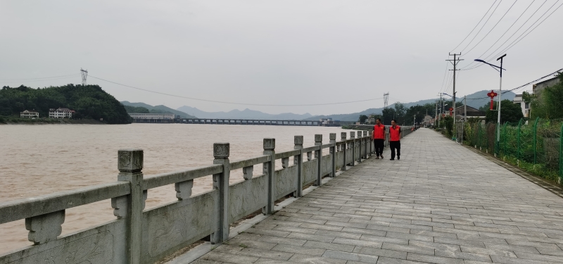 在修山电站下游,修山镇政府防汛值班人员在沿江风光带一侧巡查时,发现有村民在资水内侧垂钓,巡查人员立即上前劝离至安全地带。