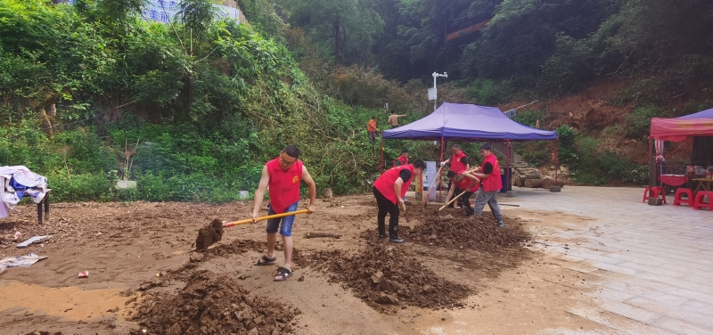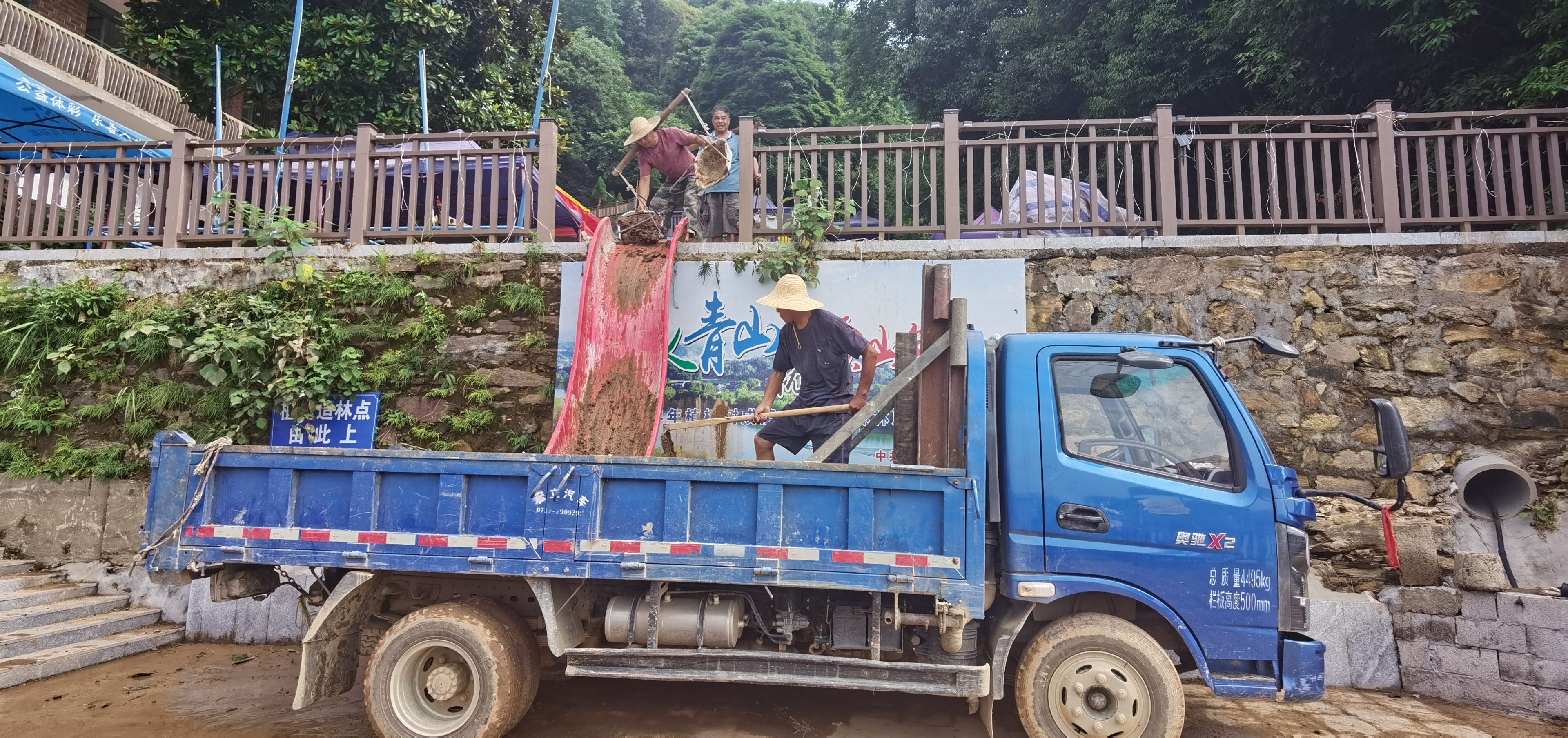 在修山景区的观景平台,受山洪的影响,整个平台被一层厚厚的淤泥覆盖着,机关党员干部、志愿者利用铁锹将淤泥铲到一起,并用簸箕运至山下,通过运输车辆运往垃圾场。