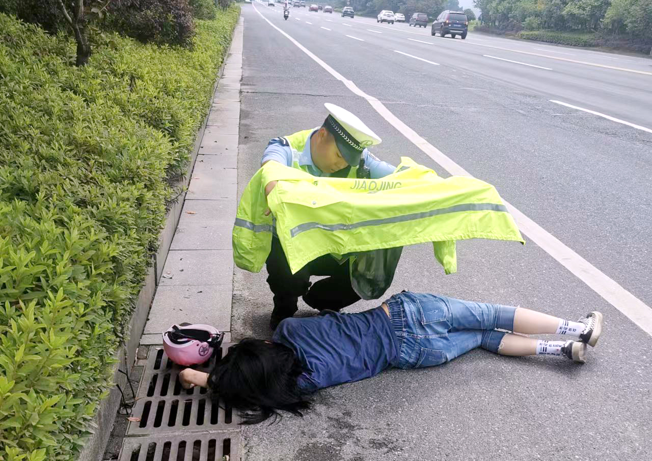 6月10日上午10时许,县公安局交警大队公路巡逻中队民警徐迎丰和辅警杨武驾车经过南环线花桥路口时,发现一女子倒卧在路边,而此时马路上车流如织,如不采取措施,倒卧女子很可能再次遭受意外。徐迎丰和杨武立即停车上前护住女子并查问情况。只见她浑身抽搐,不能言语,一辆电动自行车倒伏在不远处。