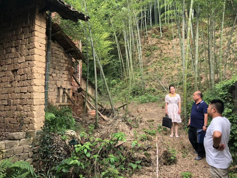 由当地村干部、镇党员干部和技术人员、县技术专家组成的四人排查小组正在浮邱山乡对一处危房进行排查