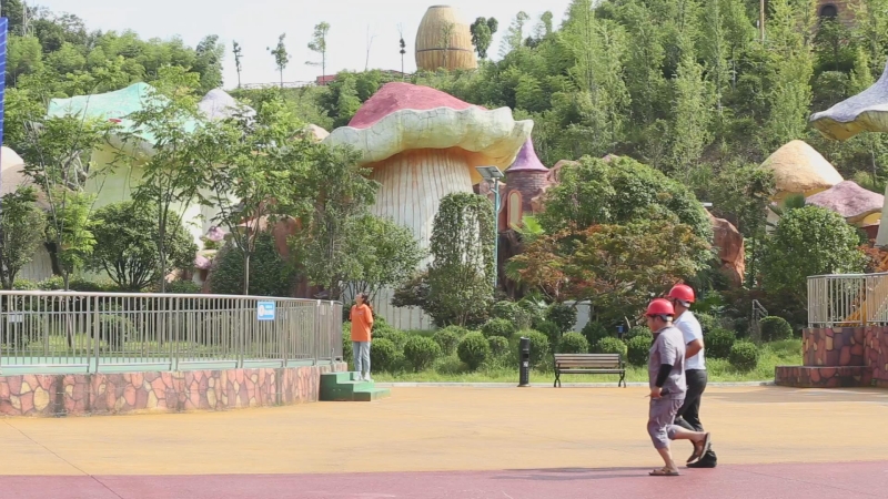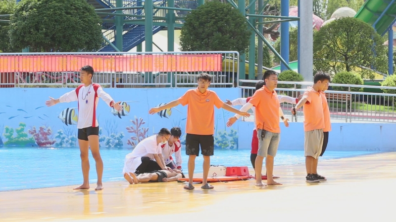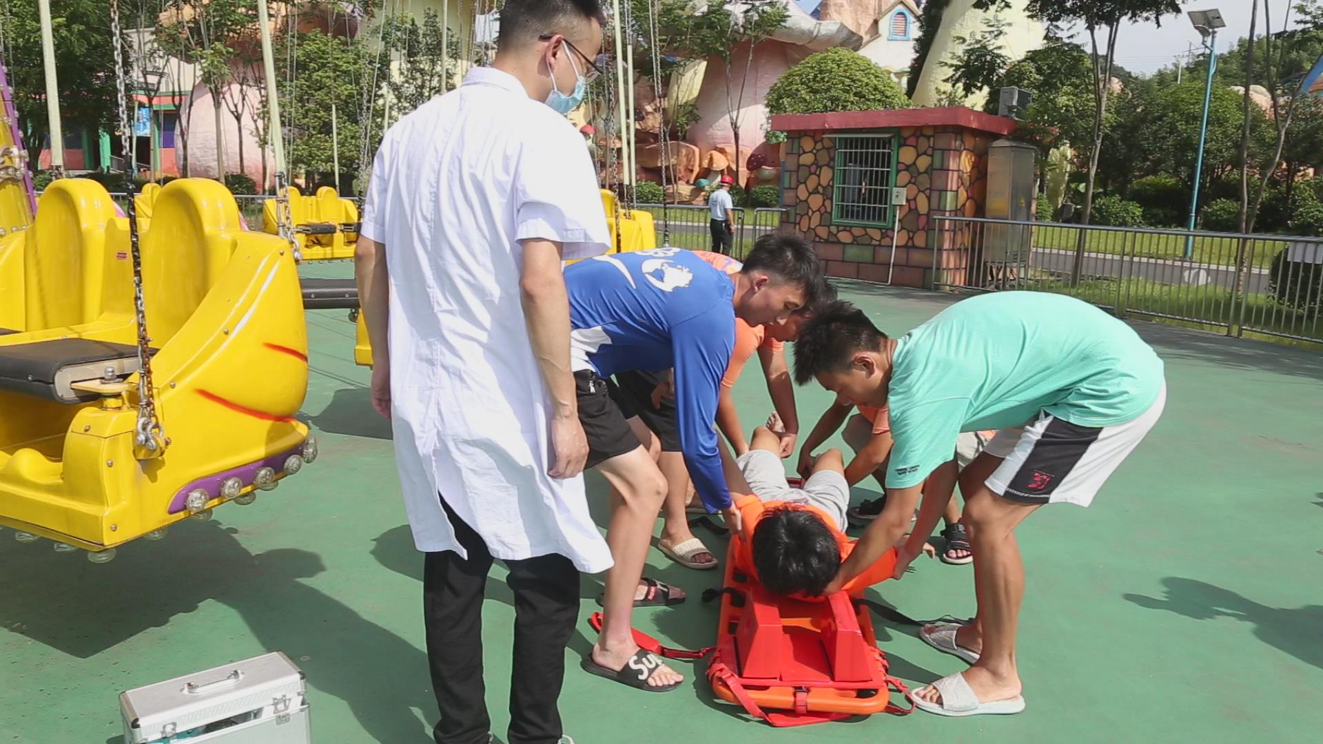 演练现场,6名景区工作人员扮作游客体验高空飞翔游乐项目。当游乐设备到最高点时设备出现故障,游客悬停空中,一名游客因受惊身体出现不适,处于昏迷状态。紧急情况下,景区立即启动大型游乐设施应急救援预案,游乐设备操作员迅速打开设施安全保护程序,景区技术人员进入设施机房展开抢修,景区游客服务部工作人员使用扩音器安抚游客情绪。经过5分钟的紧急抢修,高空飞翔游乐设施恢复正常,缓慢落地,受困游客在工作人员的引导下全部进入到安全区域,景区医疗人员对受惊吓昏迷的一位游客进行简单救治后迅速送医,演练圆满结束。当天,景区还进行了水上乐园防溺水救援演习。