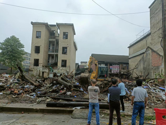 6月27日下午,伴随着挖掘机的阵阵轰鸣声,位于马迹塘镇资沂路的一栋危旧公房随之倒地。