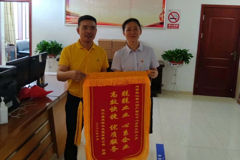 7月1日上午,桃江鑫辰实业有限公司将一面印有“兢兢业业、心系企业,高效快捷、优质服务”的锦旗送到桃江县不动产登记中心,感谢中心窗口工作人员的高效优质的服务。