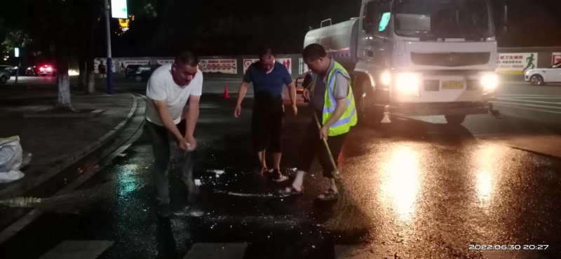 近日,桃江县城管执法局环境卫生服务中心接到群众反映,迎宾路Y形交叉口路面洒漏大面积机油,造成道路污染,并给过往车辆、行人带来重大安全隐患。
