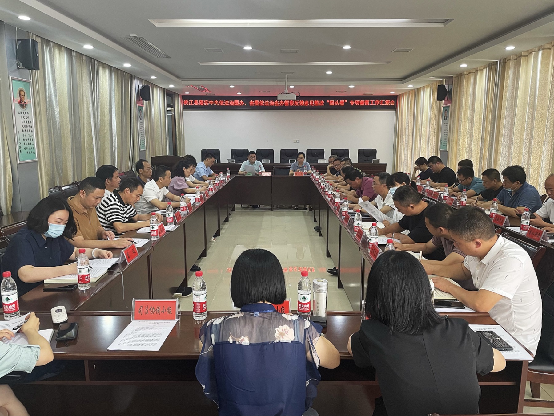 当天上午,在桃江县司法局一楼会议室,县委依法治县办汇报了桃江县法治政府建设督察整改工作落实情况、行政机关负责人出庭应诉工作和“两法衔接”工作推动情况。县政府办、县检察院、县发改局、县公安局、县市监局、县自然资源局、县交通局、县农业农村局等16家单位相关负责人参加会议。