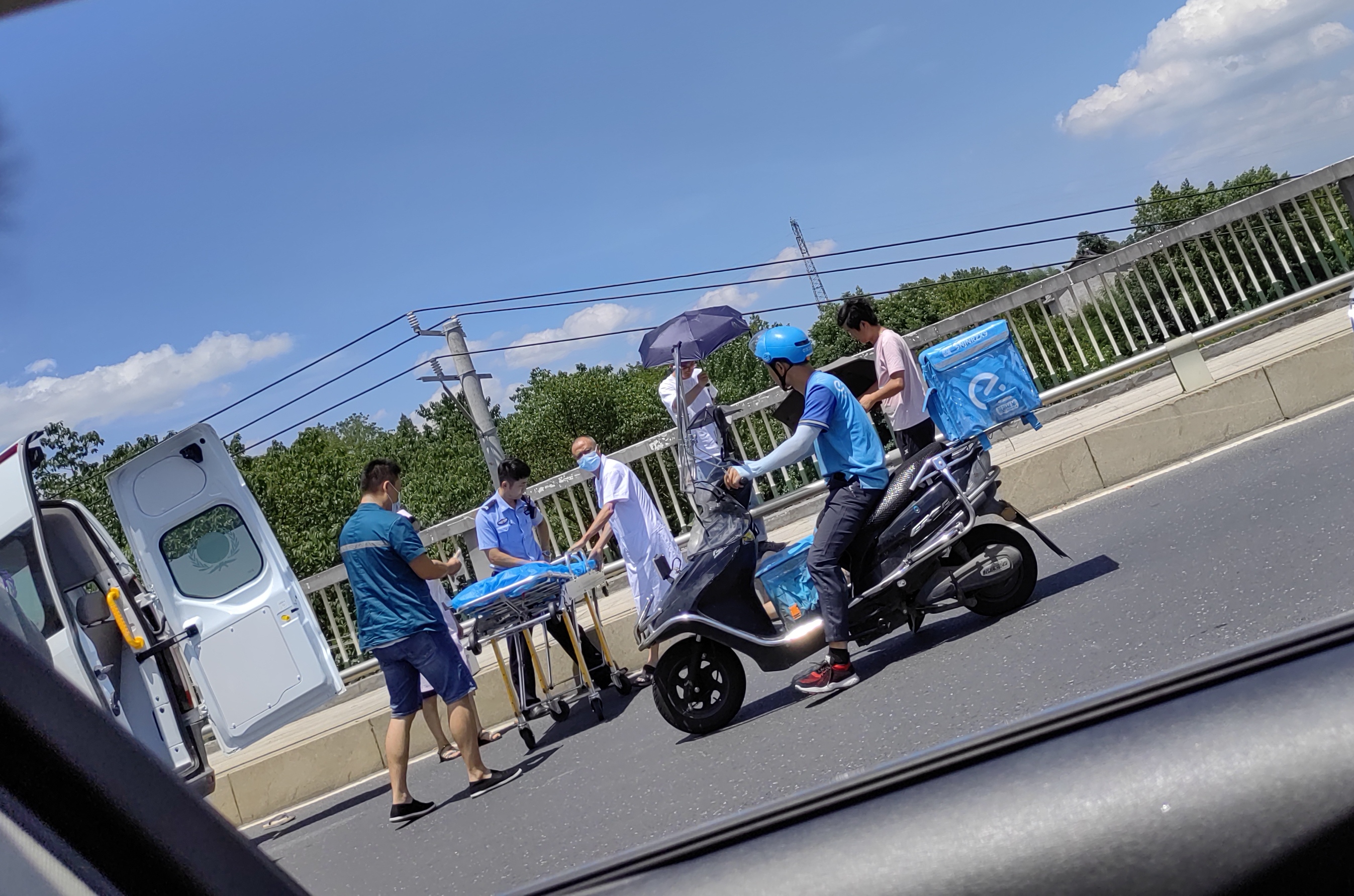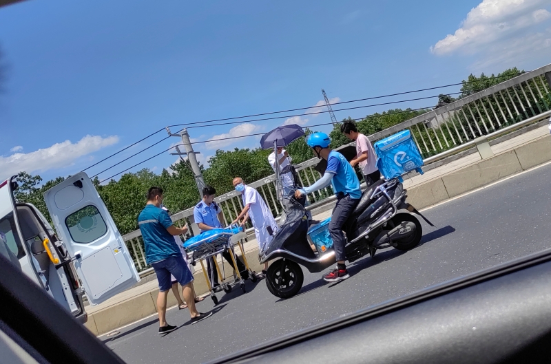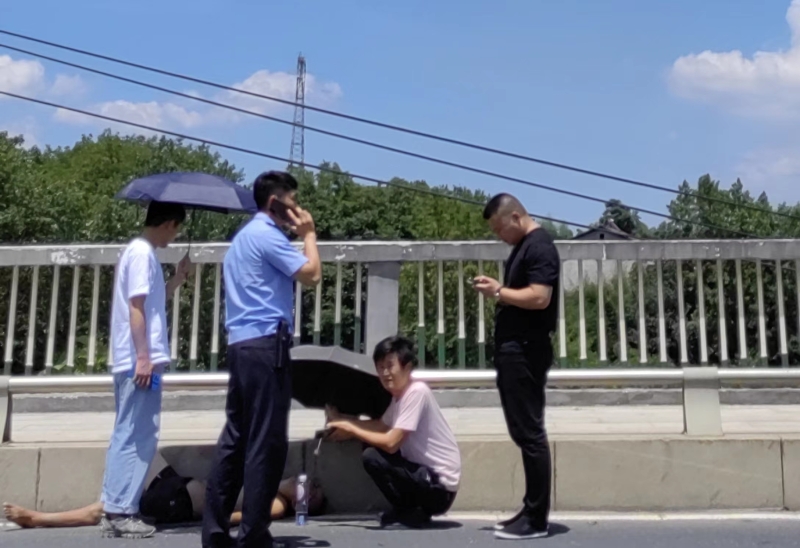 彭海望连忙拨打报警电话和120急救中心,请求救护。一旁的郭文姬从车上拿矿泉水,试图给这位男子喝。正在这时,有过往的市民拿出伞具,帮该男子遮太阳。几分钟后,牛潭河派出所民警赶到了现场,维持现场秩序,疏散围观的人群。随后,120救护车也赶到了现场,医护人员将该男子抬上车,送往医院救治。