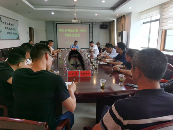 7月29日,桃江县特色食品(竹笋)风险会商会召开,县市场监督管理局、县农业农村局、县科工局等8个成员单位,八方食品、惊石农业、竹聚缘等11家竹笋生产企业负责人参加。
