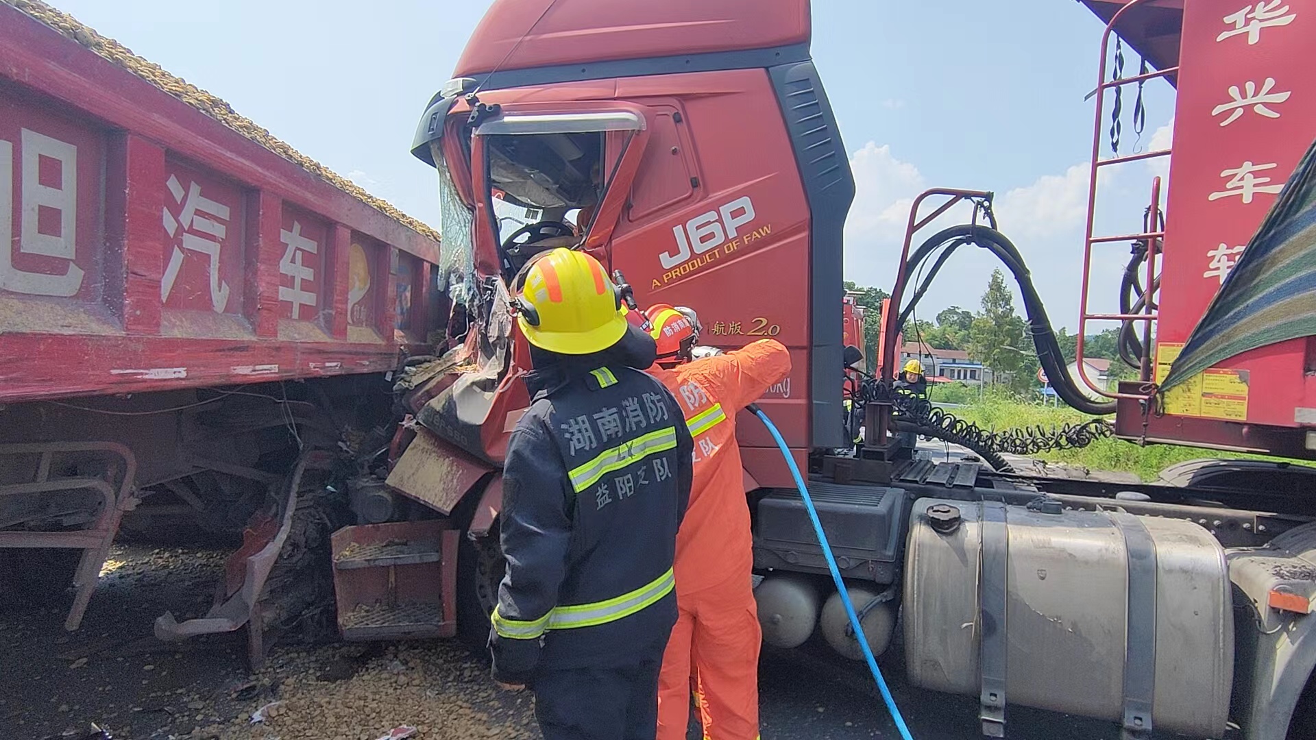 10分钟后,消防救援人员赶赴现场。经勘察,消防救援人员发现现场为两台挂车在路口转弯处相撞,导致车头严重受损,其中1台挂车的车门无法打开,驾驶员腿被卡住在驾驶室,动弹不得,无法出来。消防救援人员立即利用破拆工具组,将驾驶室进行剪扩。由于天气炎热,消防救援人员一边帮助被困司机补充水分,一边帮他扇风去热,安抚情绪。