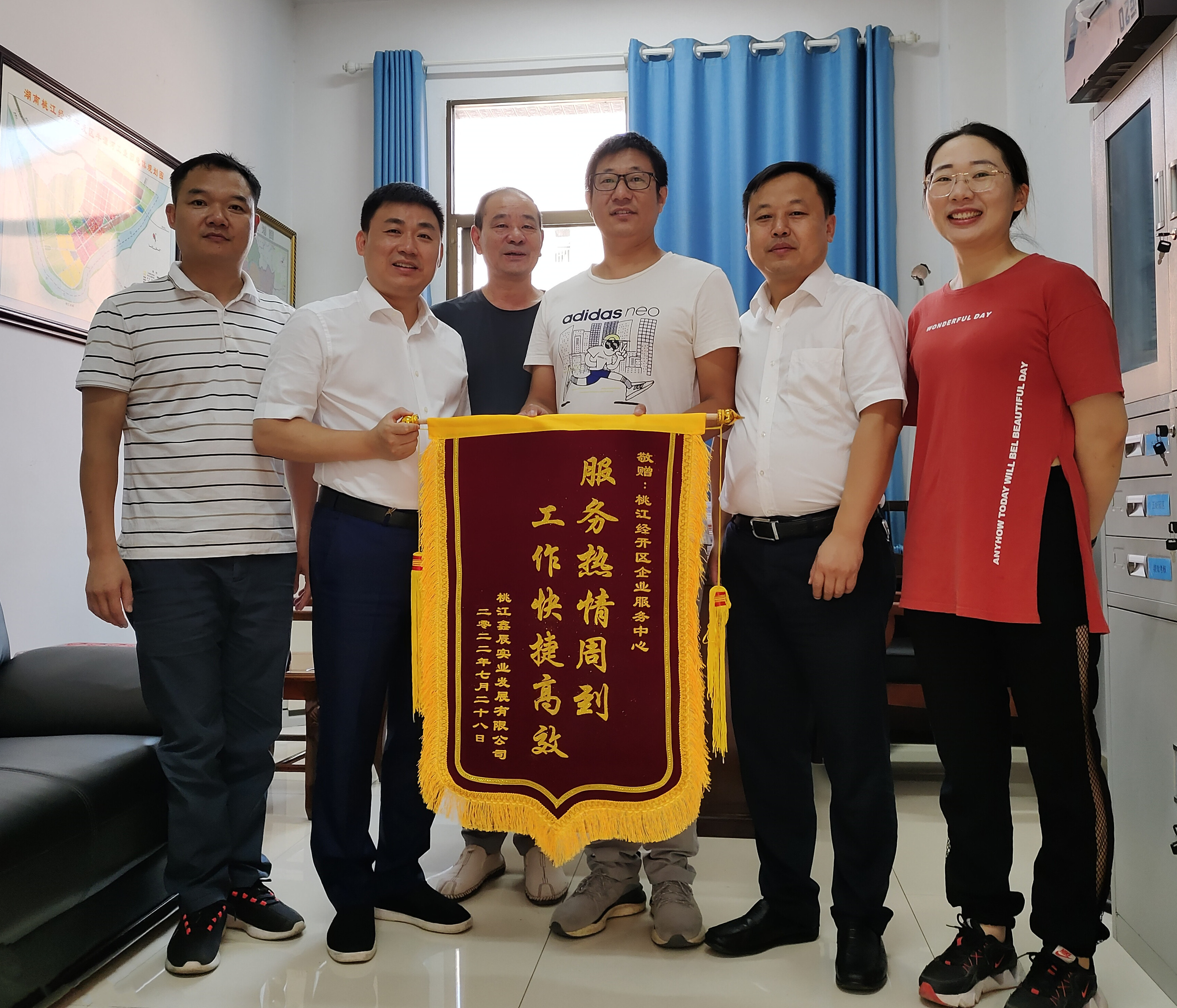 8月2日,国辰高新科技产业园(桃江鑫辰实业发展有限公司)董事长胡治国将一面印有“服务热情周到 工作快捷高效”的锦旗送到桃江经开区工作人员手中,为园区企业服务中心热情、高效的服务点赞。