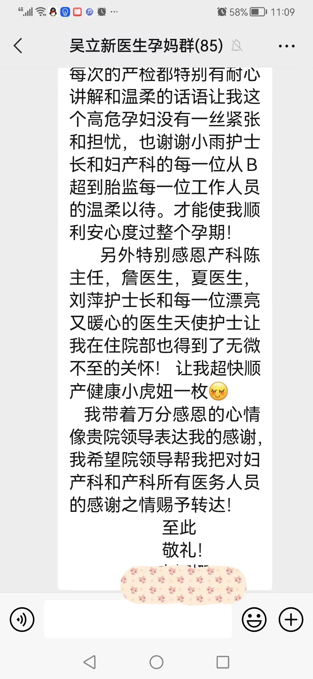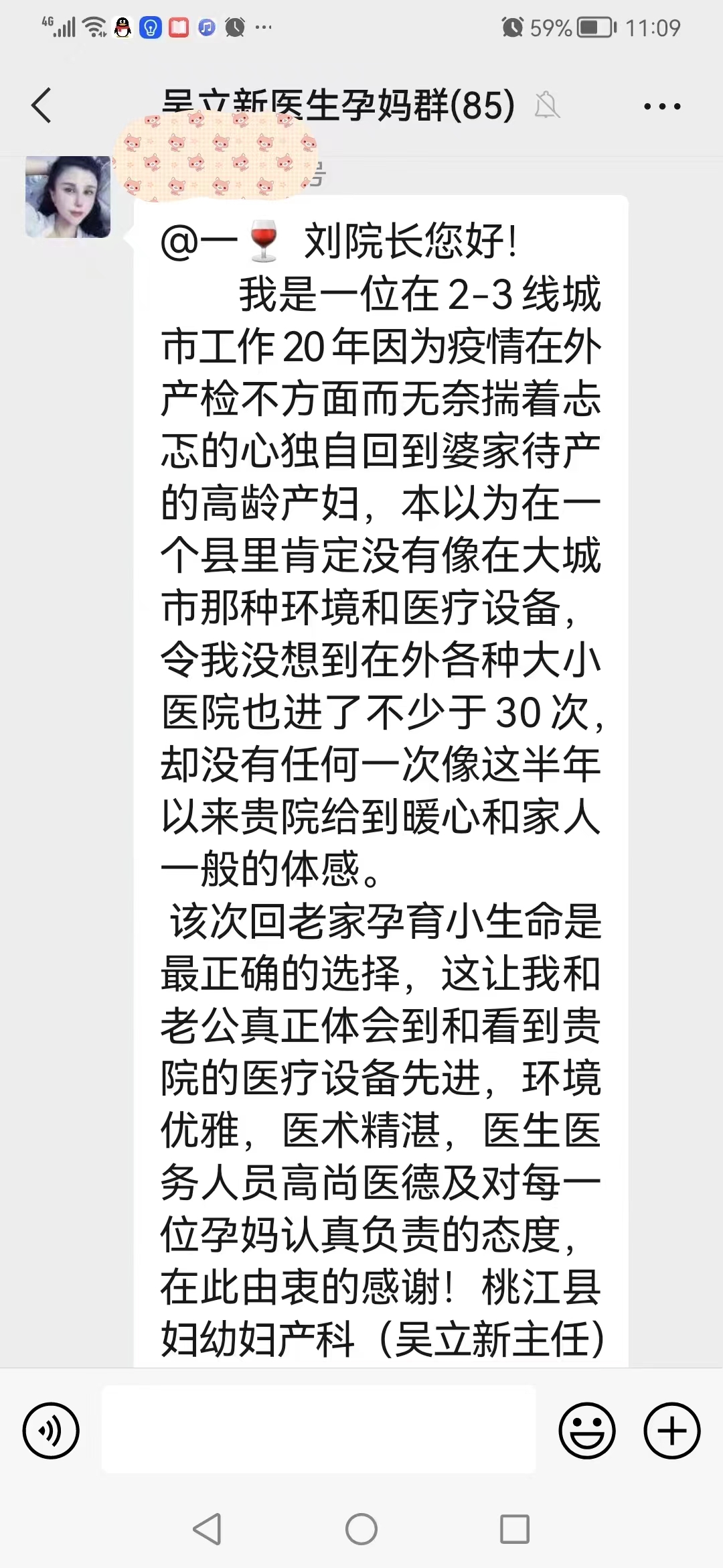 9月6日,在县妇幼保健院孕期健康管理微信群内,孕妈李女士表达了对医护人员的感激之情,以及对医院先进医疗设备、优雅就医环境和高尚医德精湛医术的赞美之情。