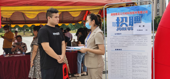 钟勇看中的湖南桃花江竹材科技股份有限公司,是一家专注于高档竹材产品研发、生产和销售的现代化林木企业,为国家高新技术企业、国家林业重点龙头企业和新三板创新层企业,专业人才需求量大。“我们今天主要是来招聘市场营销和办公室人员,普工也有招聘名额,今天投简历的人非常多,包括很多大学生也投了简历,我们回去会进行筛选,为我们即将到来的旺季做储备准备。”该公司人事主管郭小燕女士介绍。