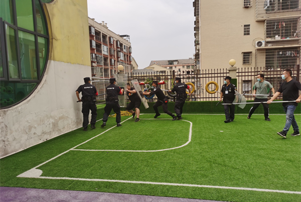 演练前,民警对幼儿园一键报警系统、反恐防暴装备等进行了检查。演练模拟幼儿园某班师生们正在操场运动,突然一名手持长刀的男子(巡特警扮演)从幼儿园后门窜入操场“袭击”小朋友们。老师们见状,迅速组织小朋友们撤至安全区域,学校保安立即鸣响警报,学校反恐防暴应急处置小组人员持防护器械迅速到位,对暴徒进行围堵,阻止暴徒施暴。与此同时,巡特警大队民警接到报警后迅速赶到现场,与学校保安人员前后夹击,迅速控制并抓获歹徒。整个演练过程分工明确,井然有序。