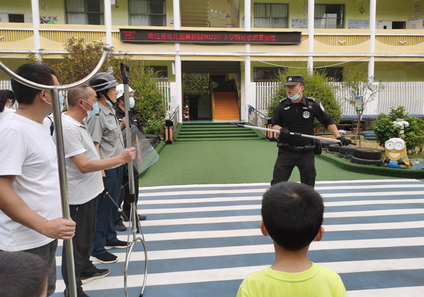 演练结束后,巡特警大队民警璩奎先后对县幼儿园总园、育英幼儿园、金峪幼儿园全体师生进行了反恐防暴安全知识教育,并组织安保人员进行反恐防暴培训,详细介绍了反恐防暴器械的种类和使用方法。