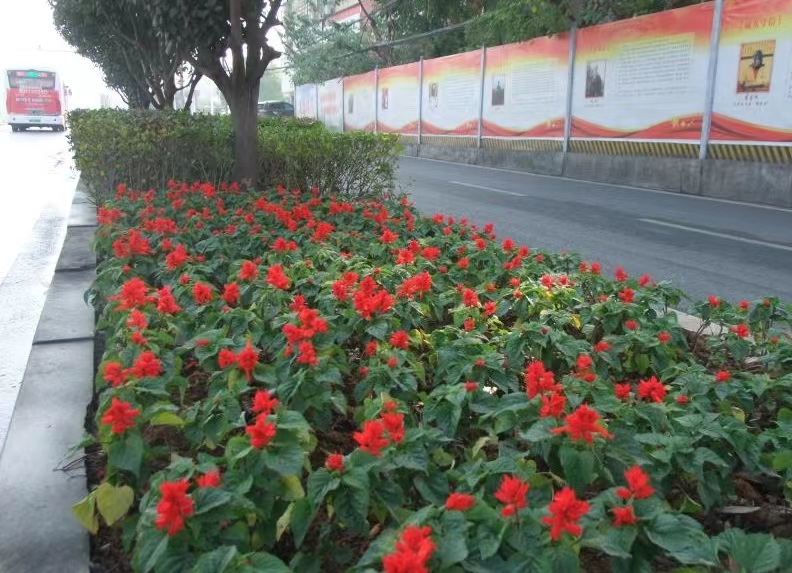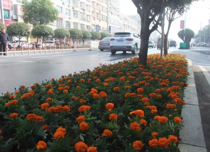 园艺人员将绿化隔离带内枯死树木进行了移除,并在芙蓉桥至华滋大厦段栽种了应季花卉孔雀草、一串红等。鲜花红黄相间、鲜艳夺目,在秋日暖阳照射下,显得喜庆热烈,给城市增添了一道靓丽的风景。
