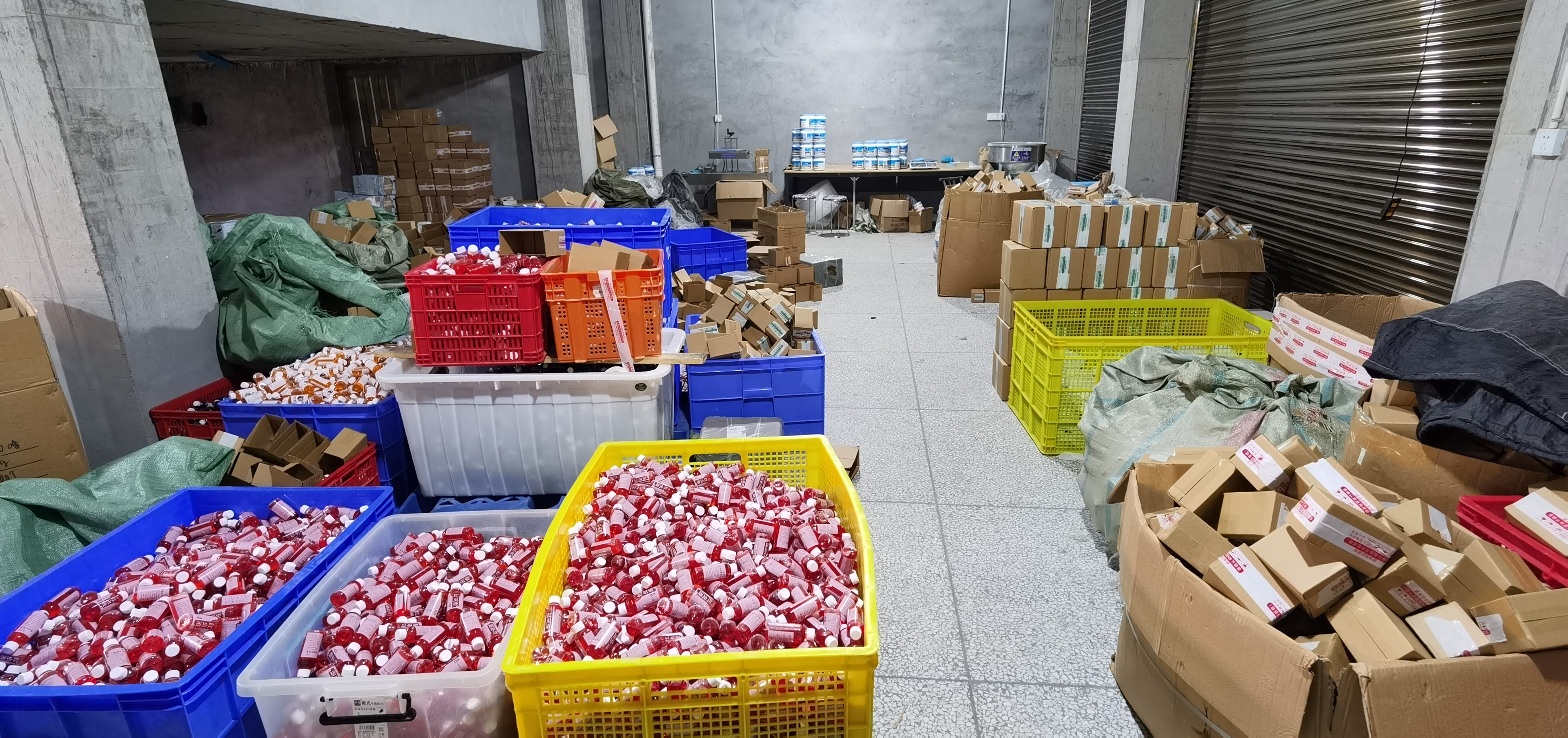 在车间的一侧,还有一条生产“红虫液”钓鱼添加剂的生产线,数千瓶“红虫液”装在储物筐里。