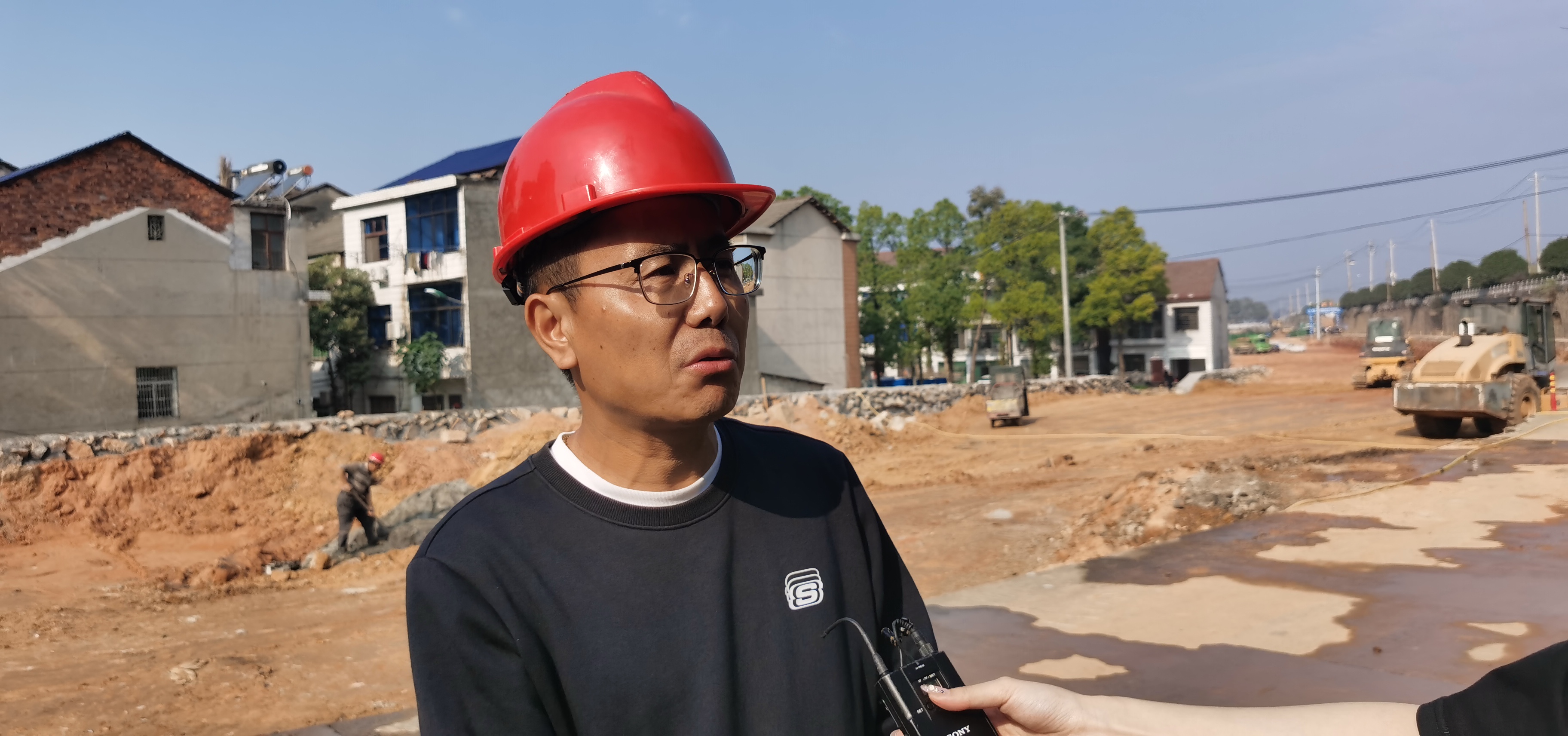 11月10日上午,记者在獭溪路建设项目的施工现场看到,一台压路机正在进行路基土方碾压,一些施工人员正在衬砌道路护坡,施工现场井然有序。