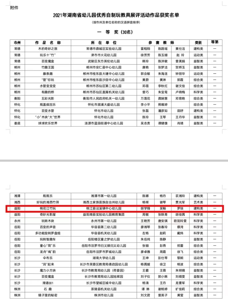 近日,从省教育厅传来喜讯,沾溪镇中心幼儿园在2021年全省幼儿园优秀自制玩教具评比中选送的“桃花江竹玩”建构材料系列,从全省各市州150件参评作品中脱颖而出,荣获一等奖。