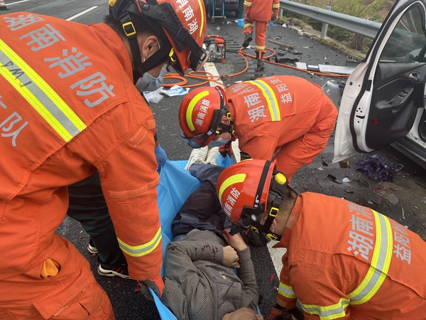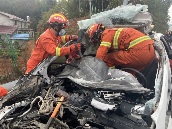 消防救援人员现场勘察发现,一辆小车由于驾驶不慎追尾了前面一辆货车,导致小车车头损毁严重,副驾驶及后座共有2人被困,情况十分危急。指挥员在与医护人员沟通后根据现场情况,迅速确定救援方案,展开救援。消防救援人员利用液压破拆工具在不伤及被困人员的情况下,对副驾驶室变形部位进行扩张、剪断、顶撑,扩大施救空间。同时稳固车门,确保车门不会回弹,防止对被困人员造成二次伤害。经过紧张的救援,15时18分,两名被困人员被成功救出,并由120送往医院救治。消防救援人员清理完现场,交接交警后撤离现场。
