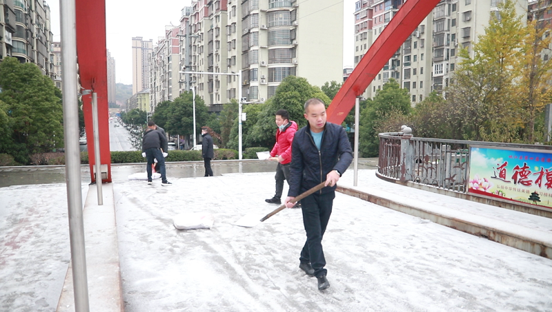 上午9时,记者先后在县城芙蓉桥以及人行桥上看到,县城管执法局工作人员正在桥面铲雪、除冰、撒盐、降低冰雪冰冻天气给出行车辆和行人带来的交通不便等不利影响。