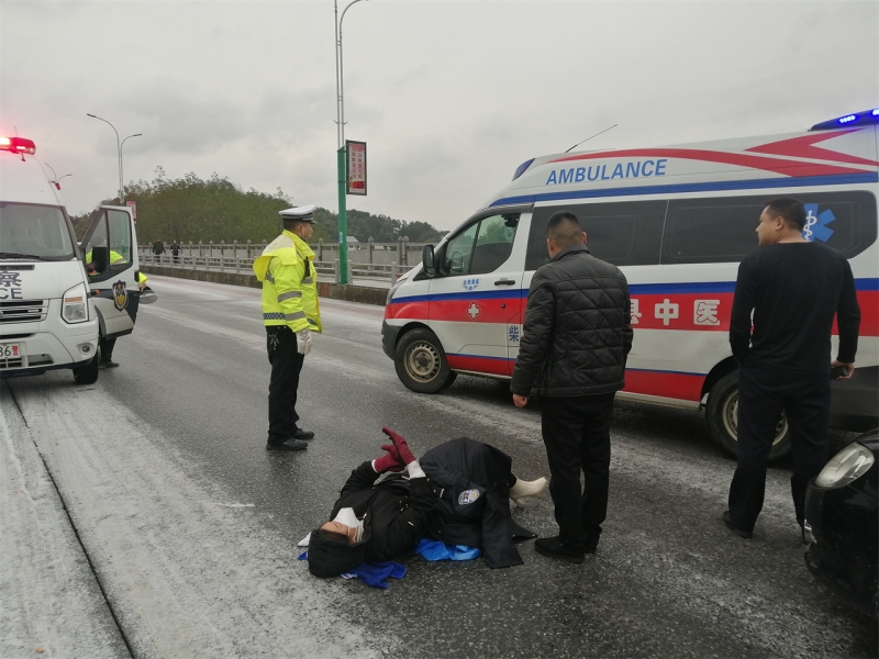 为防止伤者二次受伤,黎昭身着单薄的T恤衫在雨雪中维持着交通秩序,直至120救护车赶到现场,协助医护人员将伤者送上救护车。