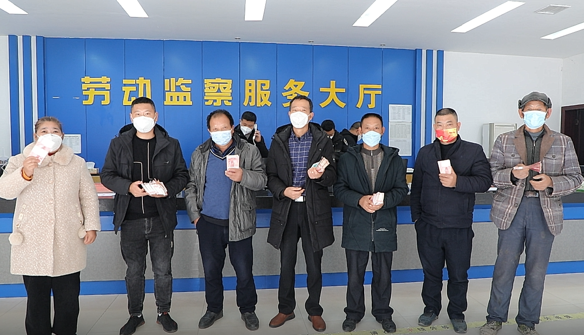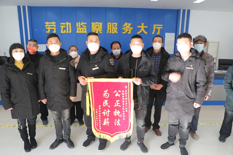 12月23日上午,农民工谢伟、王文革等人将一面印有“公正执法 为民讨薪”字样的锦旗送到县劳动监察大队监察人员手中,表达他们对监察员依法依规解决诉求,提高群众获得感、幸福感、安全感的感激之情。