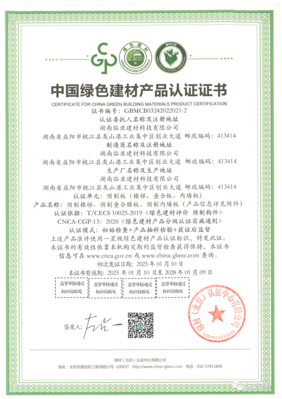 喜讯!湖南临亚建材科技有限公司荣获中国绿色建材产品认证证书