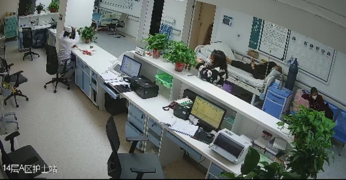 监控显示,在医院呼吸与危重症病区的护士站和医生办公室,一名女子拿着一叠红色的挂饰,这些挂饰上分别写着“新年快乐”“年年有鱼”“健康平安”等字样,她将这些挂饰一个个系在绿植上。