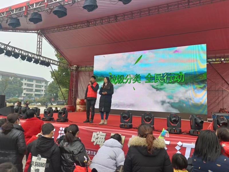 增设分类投放设施,践行垃圾分类“新时尚”。城管局组织工作人员在紫金湾广场、金盆广场、凯邦华通城三个会场内外增设分类垃圾桶50余个,便于对活动现场产生的垃圾进行分类投放和分类运输,同时安排了垃圾分类督导员15名,指导群众对垃圾进行分类投放。