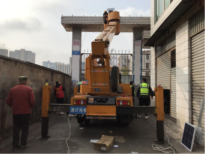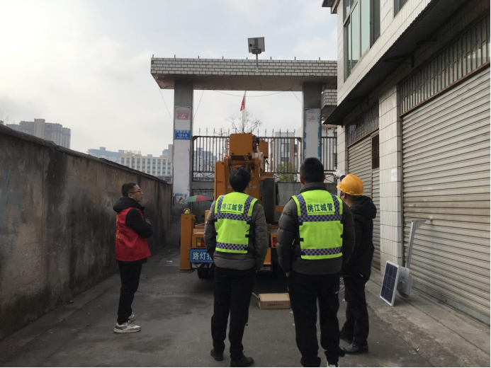 2月25日上午,在近桃社区居民巷子里,城管执法局路灯管理所工作人员正在安装调试太阳能路灯。