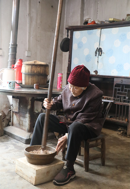 眼前这位正在打擂茶的老奶奶叫詹秋莲,记者见到她时,老奶奶一边擂茶,一边与一位妇女聊天。老人的二儿子贺国良告诉记者,今天是“三八”妇女节,当地社区的妇女主任特意上门看望老母亲,老人特别高兴,表示要亲自打擂茶招待来看望她的客人。二媳妇张菊华配合将擂茶的原料放入擂钵后,老人独自脚夹擂钵,手持近两米长的擂茶棒,动作娴熟地打起擂茶来。打擂茶是一个集体力、技艺融于一体的活儿,在七八分钟的擂茶时间里,老人中间只稍许休息了一会,便打出了一钵香气四溢的擂茶。之后,老人还亲自盛茶,与客人分享。