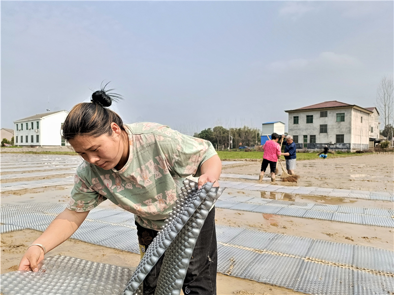 刚送完饭,贺丽姣又急着往回赶。她在莲盆嘴村承包了1280亩稻田,集中育秧面积有50亩。当天,这边也请了帮工在做秧,一回来,她就赶紧下田给育秧拱棚盖地膜。
