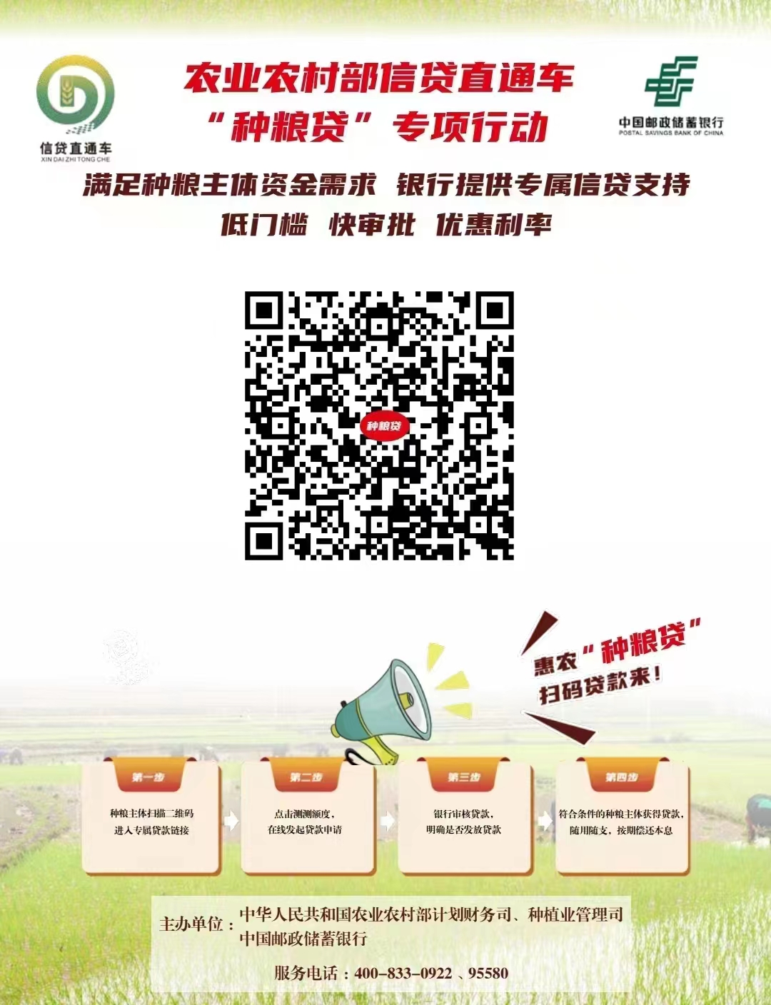 眼下,正是春耕大忙的季节,为帮助广大粮油种植大户缓解生产资金缺口,农业农村部计财司和部种植业司联合邮储银行,启动信贷直通车“种粮贷”专项行动,支持种粮农户通过扫描二维码(见图),在线申请“低门槛、快审批、优惠利率”的种粮贷款。