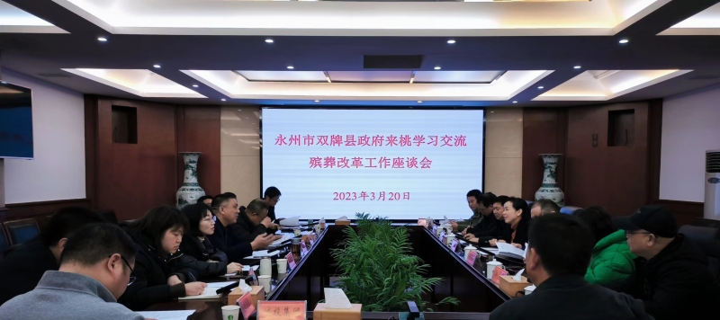 3月20日,永州市双牌县政府办副主任杨迪带领民政、人社、自然资源、林业、城管、城投公司等职能部门来我县考察交流殡葬改革工作。县政府办、县民政局相关领导参与陪同。