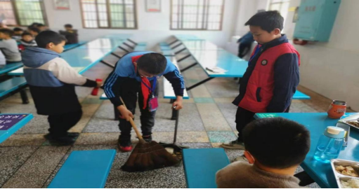 高年级的“小雷锋”哥哥帮低年级同学清扫掉在地上的饭菜