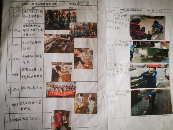 活动以各班级为单位,开展争当“小雷锋”“三个一”活动:班主任每天一总结、学生每人每天一发现、每人每天一好事。自活动开展以来,涌现出一批“班级小雷锋”“校园小雷锋”“学雷锋先进班集体”。