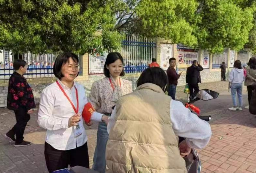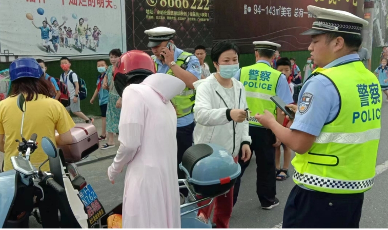 4月19日早上7点20分,正是学生上学高峰。在桂花园小学校门口,6位值班教师正在维持交通秩序,对不戴头盔骑电动车、摩托车送孩子上学的家长开展宣教,劝导他们要戴好头盔,遵守交通规则,确保安全。