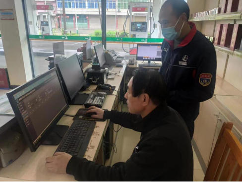 工作人员检查马迹塘加油站散装汽油系统平台安全情况