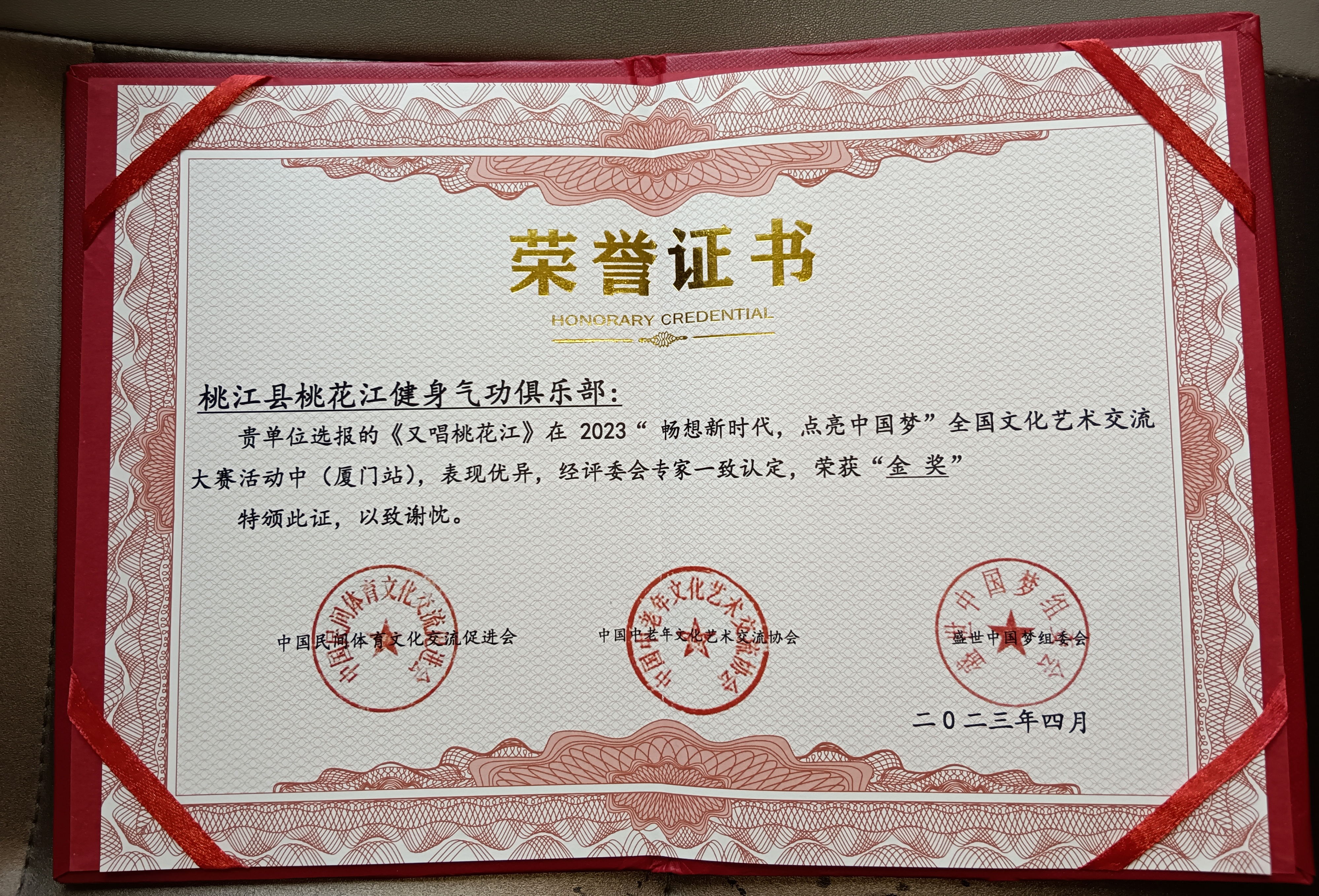近日,由中国民间体育文化交流促进会、中国中老年文化艺术交流协会、盛世中国梦组委会联合举办的全国文化艺术交流大赛在福建厦门举行。桃花江健身气功俱乐部表演的《又唱桃花江》健身气功大舞荣获本次大赛金奖。
